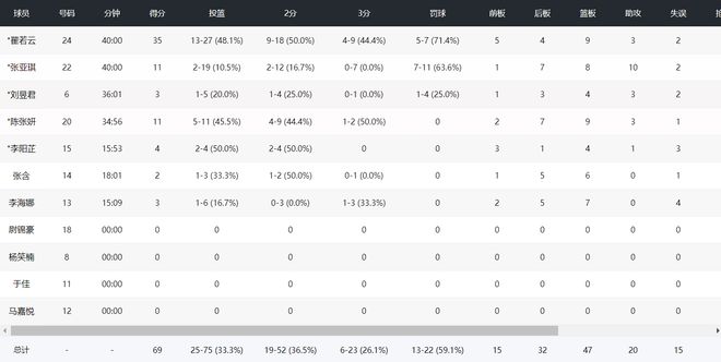 全队只用了7人轮换,张亚琪、翟若云都打满40分钟,只可惜张亚琪全场比赛19中2+三分7中0状态稀烂,陈张妍11分,张亚琪11分,全队拿69分,翟若云一人40分得分占比全队57.97%,这是何等的壮烈?