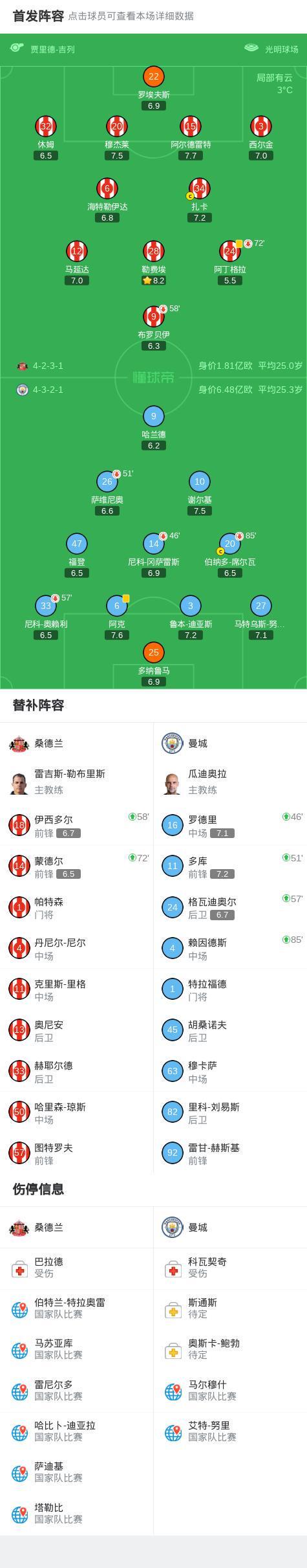 北京时间1月2日英格兰足球顶级联赛 联赛 第19轮,桑德兰主场对阵曼城。上半场B席破门被吹,多纳鲁马扑单刀,哈兰德抽射造险,下半场萨维尼奥屡失良机,格瓦迪奥尔险破门+中柱。最终比分桑德兰 0-0 曼城。